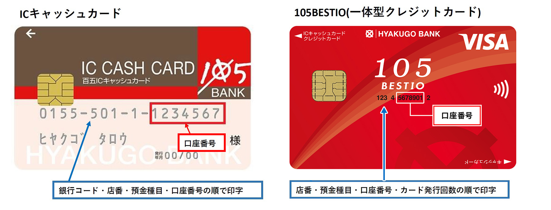 ICキャッシュカードの場合 銀行コード(百五銀行 0155)- 店番(3桁 501)- 預金種目(1桁 普通預金)- 口座番号(1234567)の順に記載されています。 0155 - 501 - 1 - 1234567