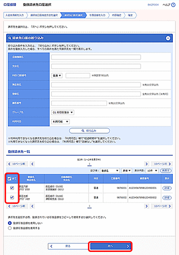 対象となる請求先、登録引落金額の使用有無を選択し、[次へ]ボタンをクリックしてください。