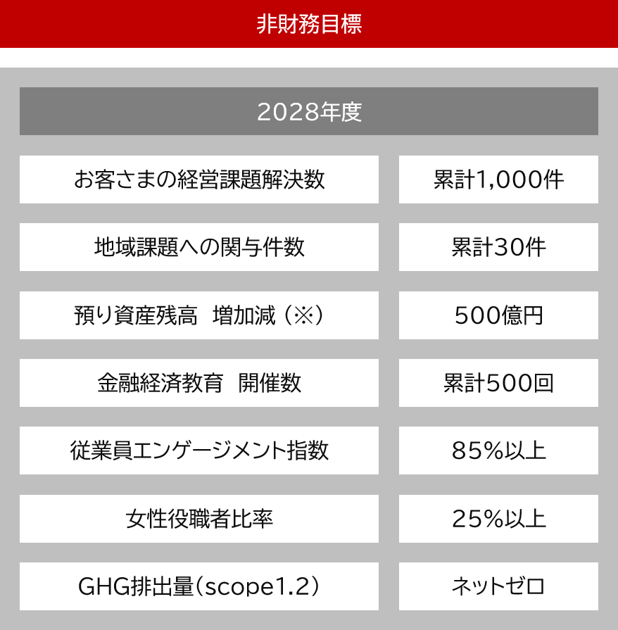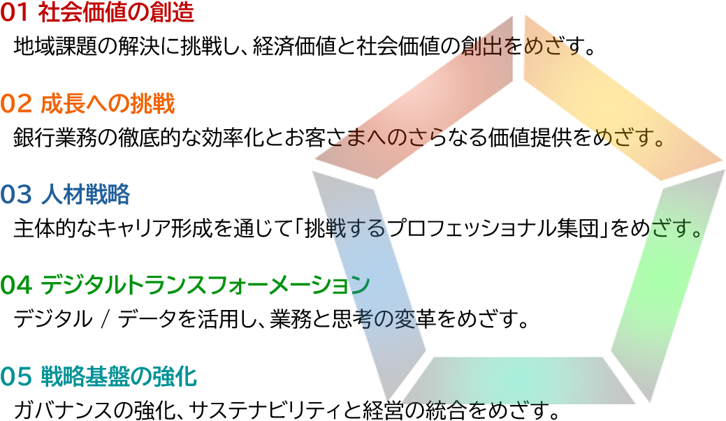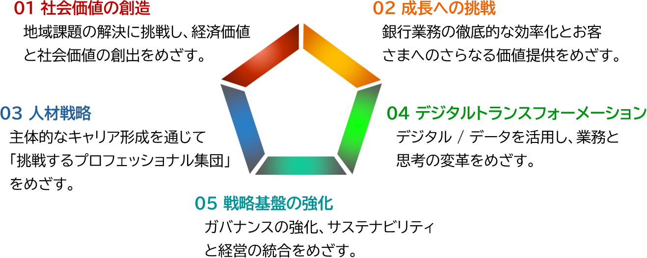 この実現に向けて、コアビジネスである「銀行業」の強固かつ効率的な事業態勢の構築と、「地域を創造する新事業」の創出や育成に積極的に取り組みます。