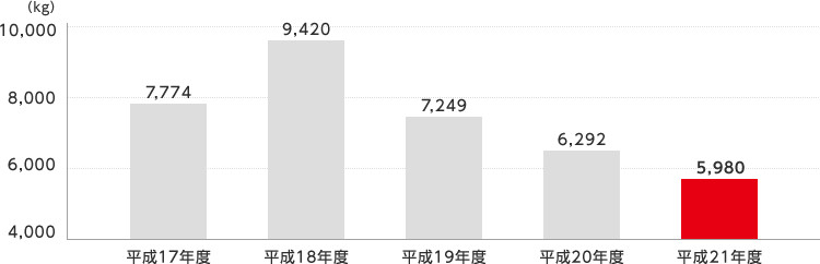 | 環境目標「紙の月間平均使用量を6,362kg以下に抑える」に対して、結果は月間平均5,980kgと目標を大きく達成しました。還元資料の電子化・融資稟議書の電子化・事務要綱の電子化・オペマニュアルの電子化といったペーパーレス化システムが貢献し、使用量の計測を開始以降、最少の使用量となりました。なお、平成21年度の月間平均使用量は、新システムの開発で使用量がピークであった平成18年度の使用量(9,420kg)比で約37%もの削減となりました。 | |