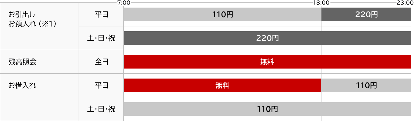 | ※ | 利息制限法の改正によりATMご利用手数料が220円の時間帯でも110円となる場合があります。 (利用明細票に記載された手数料額と実際の手数料が異なります。) |