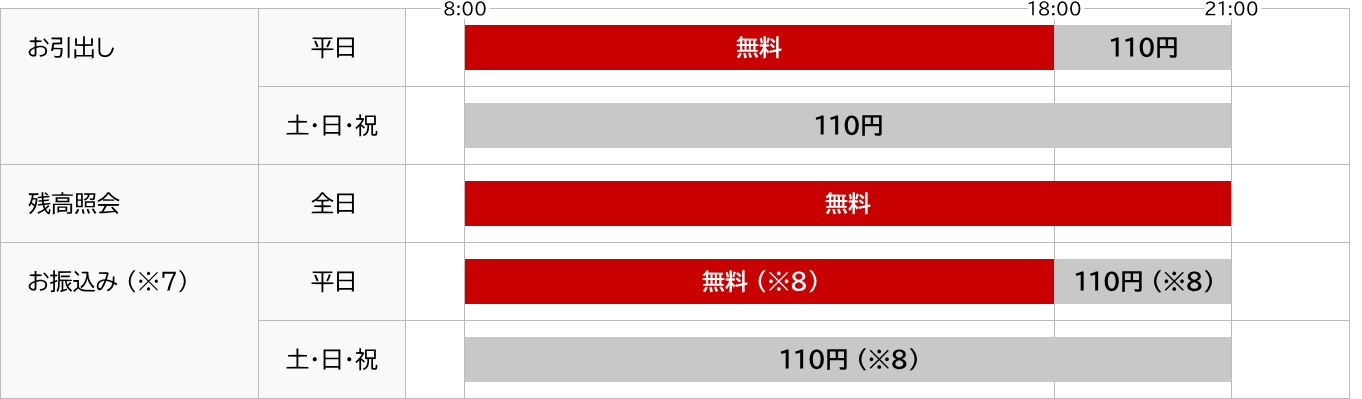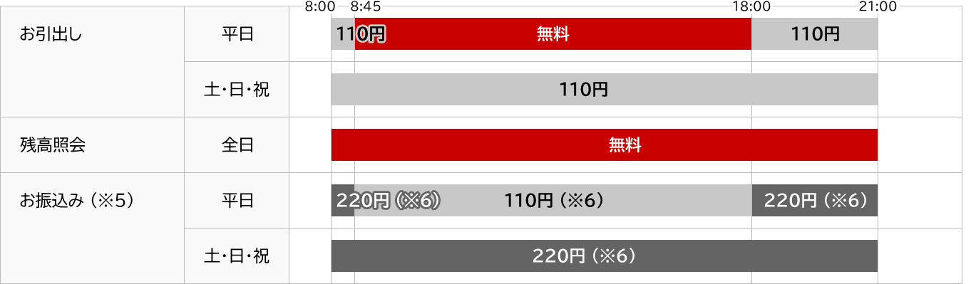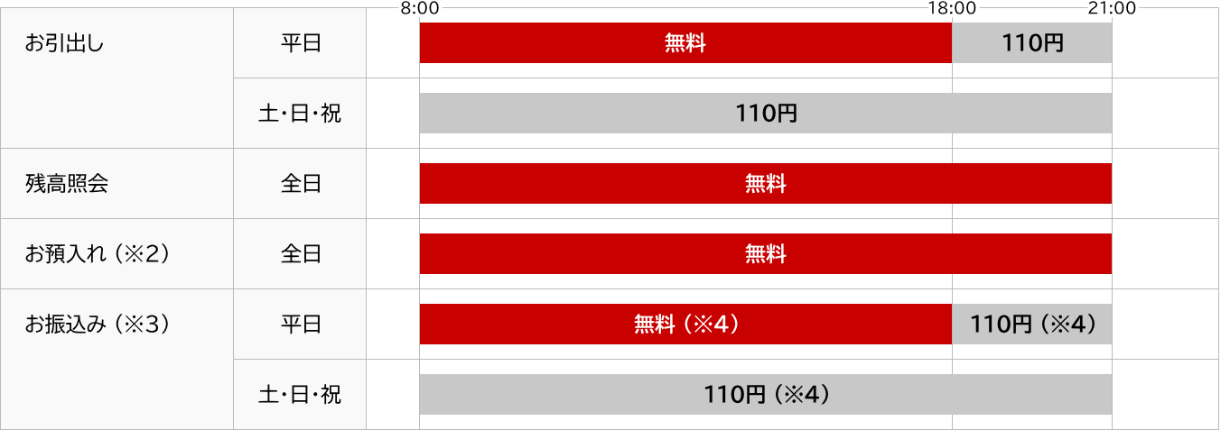 | ※ | 銀行休業日や延長時間帯にお引出しいただく場合には各金融機関所定の手数料が必要となります。 |