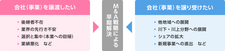 後継者への事業の承継、会社の抱える経営課題・将来戦略を解決するためのM&A戦略をサポートいたします。