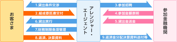 主幹事(アレンジャー)が複数の金融機関を募って、シンジケート団を組成(アレンジ)し、お客さまに対し同一契約書・同一貸出条件でご融資する形態です。