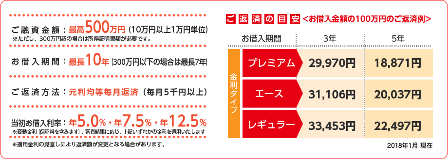 | 返済方式 | 元利均等毎月返済(毎月返済額は5千円以上) | |||||||||
