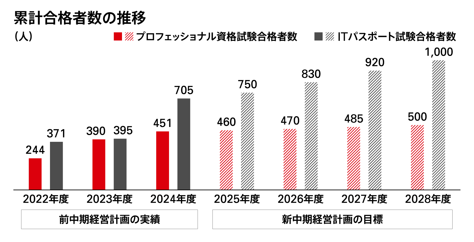また、当行ではデジタル分野の知識習得やリテラシー向上を図るため、国家試験である「ITパスポート試験」についても合格支援を行っています。前中期経営計画では目標500人に対し、合格者数705人と大幅に目標を上回りました。新中期経営計画では目標1,000人を掲げ、合格支援を継続しています。